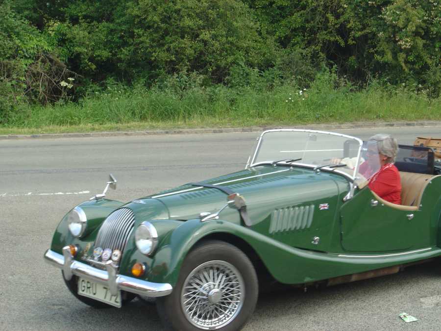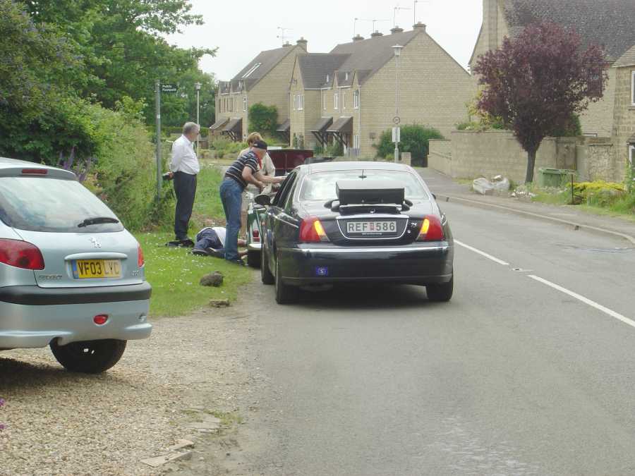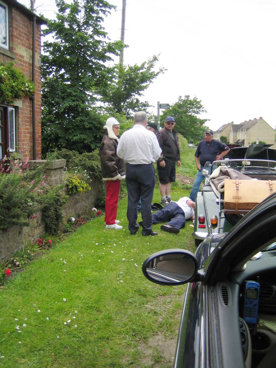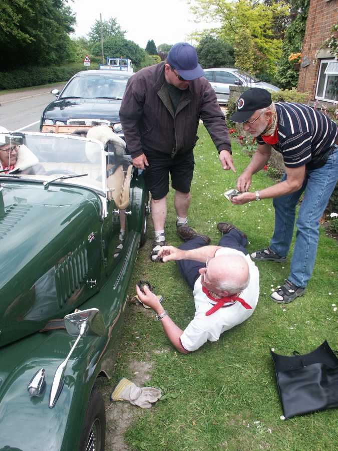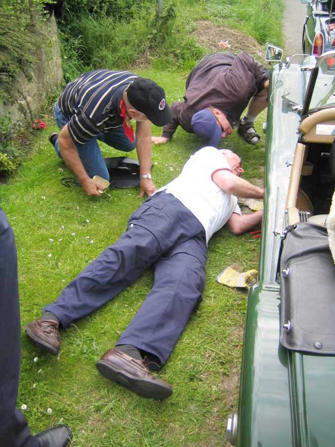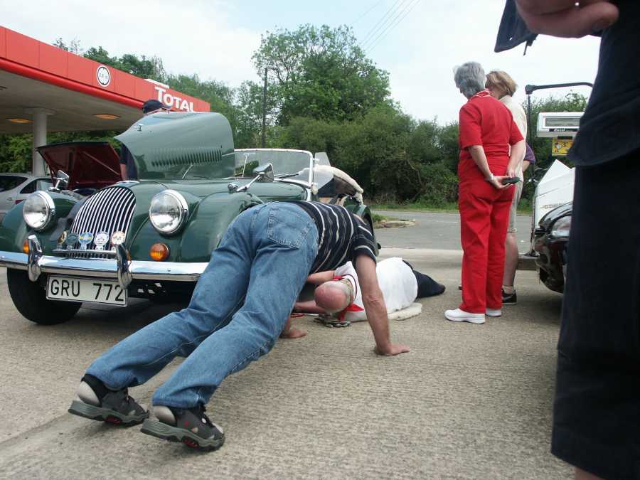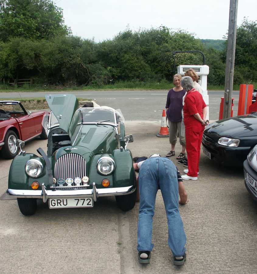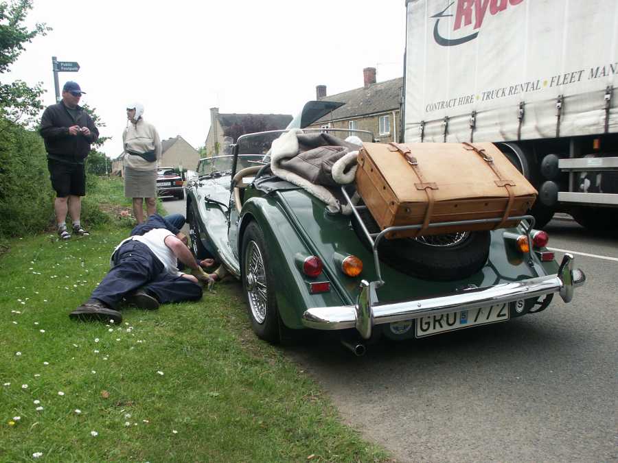 Strax efter lunchrasten släppte en klammer i Mattssons Morgans avgassystem. Vi hade väckt hela den sömninga engelska landsbygden om vi fortsatt. Stopp för hela karavanen alltså.